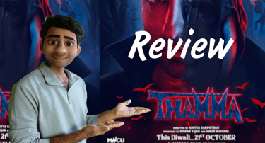 MOVIE REVIEW :-Hello all and welcome to the review. Today, I am going to review the movie (Thamma). starring Ayushmann Khurrana, Rashmika and Nawazuddin in the lead roles. After watching this movie, it is a new installment movie in the Madok horror universe, so I felt that it is not worth giving my opinion. It is definitely not the quality of the previous movies. Now let's go into the Indeath review. In this, our hero's name is Alok. One day, he goes on a vacation in the jungle with his friends. There, a bear attaches itself. What kind of chains come into his life from there? How did Taraka come into his life? What is the link between this story and Betail? The movie Madok's horror universe has an expectation. Women's movies are good, there is an emotion in Bhedi. But recently, for some reason, it seems that they are not focusing properly. Moonjiya is not as great as the movie. This Thamma movie that has come out now is also okay, but it doesn't seem like they put in proper effort. For this movie to work, the main thing is that the love story should work. But I got a disconnect there. There is no chemistry between the actors, but if the writing is not right, then who will do it? Taraka saves Alok. But why does he love? There are no convincing scenes. Taraka also falls in love with Alok. But why is it a real love story, we should connect to those characters. That doesn't happen here. But it's not all bad either. The comedy works a little. Especially the scenes between Alok and his father and the scenes between Taraka and Alok's family are good.